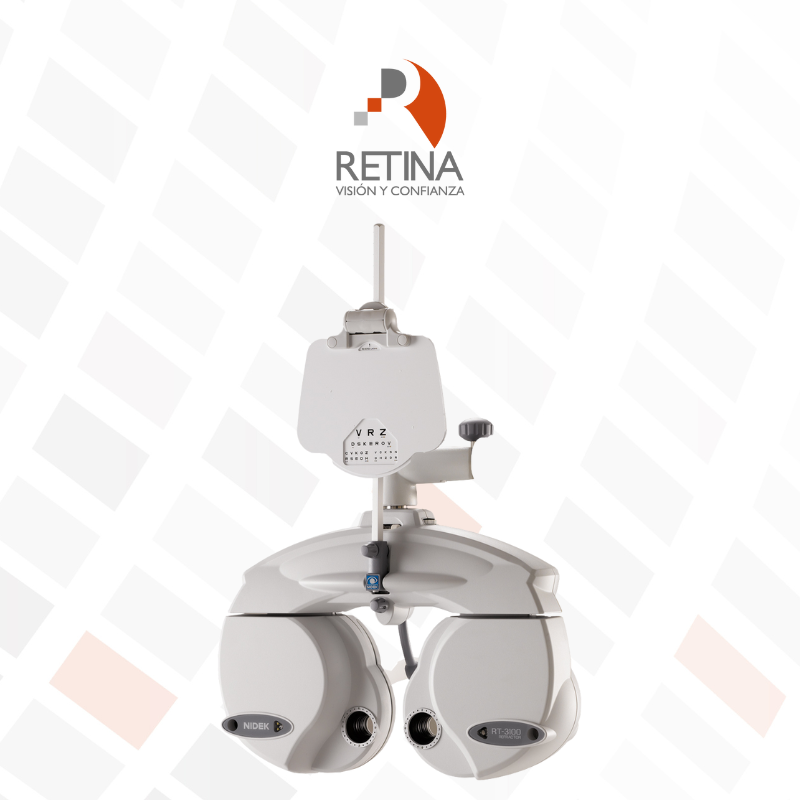 El foropter RT-3100 marca NIDEK, es un instrumento computarizado que se caracteriza por su diseño sofisticado, se utiliza para la refracción subjetiva. Este equipo tiene un sistema electrónico para posicionar lentes esféricos y cilíndricos, prismas y otros dispositivos ópticos frente a los ojos del paciente con el objeto de determinar errores refractivos y funciones binoculares.
